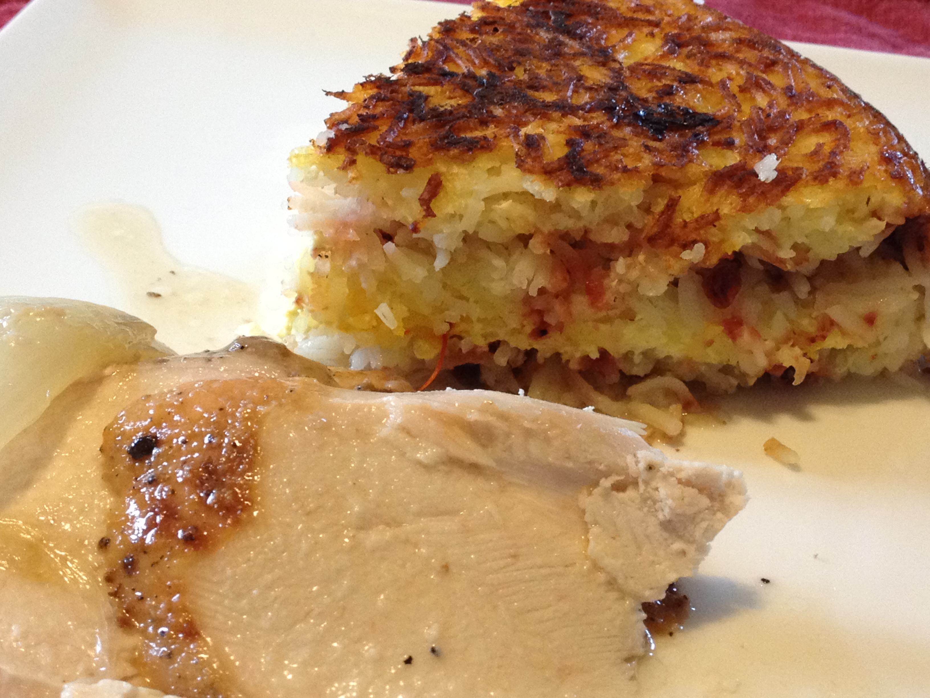 I learned Persian cooking years ago and am dredging up some of the recipes that I made many moons ago. Zereshk Pullow or Basmati Rice with Bayberries is one of many traditional Persian dishes. One thing you will find when learning the cuisine of Iran is that recipes vary from family to family and region to region. This is how I was taught to make it. Persians cherish their rice dishes and one thing that separates rice cooked in the Persian way from most other methods of preparation is what is called “Tahdig” its the crisp crust that forms at the bottom of the pot when you are cooking the rice. The rice is par cooked and steamed. Zereshk pullow is basmati rice laced with bayberries and layered with yogurt infused with saffron. I always served with roast or braised chicken. I was taught two ways to make this dish, one you serve the chicken separately and the other method is to layer shredded roast chicken and steam it along with the rice. I prefer it on the side so that is what I am featuring in this recipe.