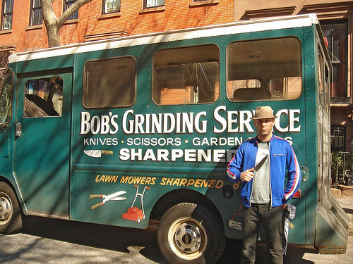 Every month or two the green grinding truck arrives on my block, ringing a bell, announcing that he is here to sharpen your knives, scissors,or even lawnmowers. Bob’s Grinding Services has been in business, using the same truck for years and years. He rings his bell to let you know he is there and stops mid block so people can bring their items for sharpening. His name isn’t Bob, I actually think it could be Henry, he greets everyone with a smile and happily sharpens whatever you bring to him, you can tell he loves what he does and it makes me smile when I see and hear his truck moving slowly down the street. We are all so busy with our contemporary lives, and seeing these businesses that are basically doing things the same way they were done many, many years ago makes me want to slow down and remember kinder, gentler times. He was here on Saturday and sharpened my chef’s knife and paring knife and did such a great job, I could split a hair!!
