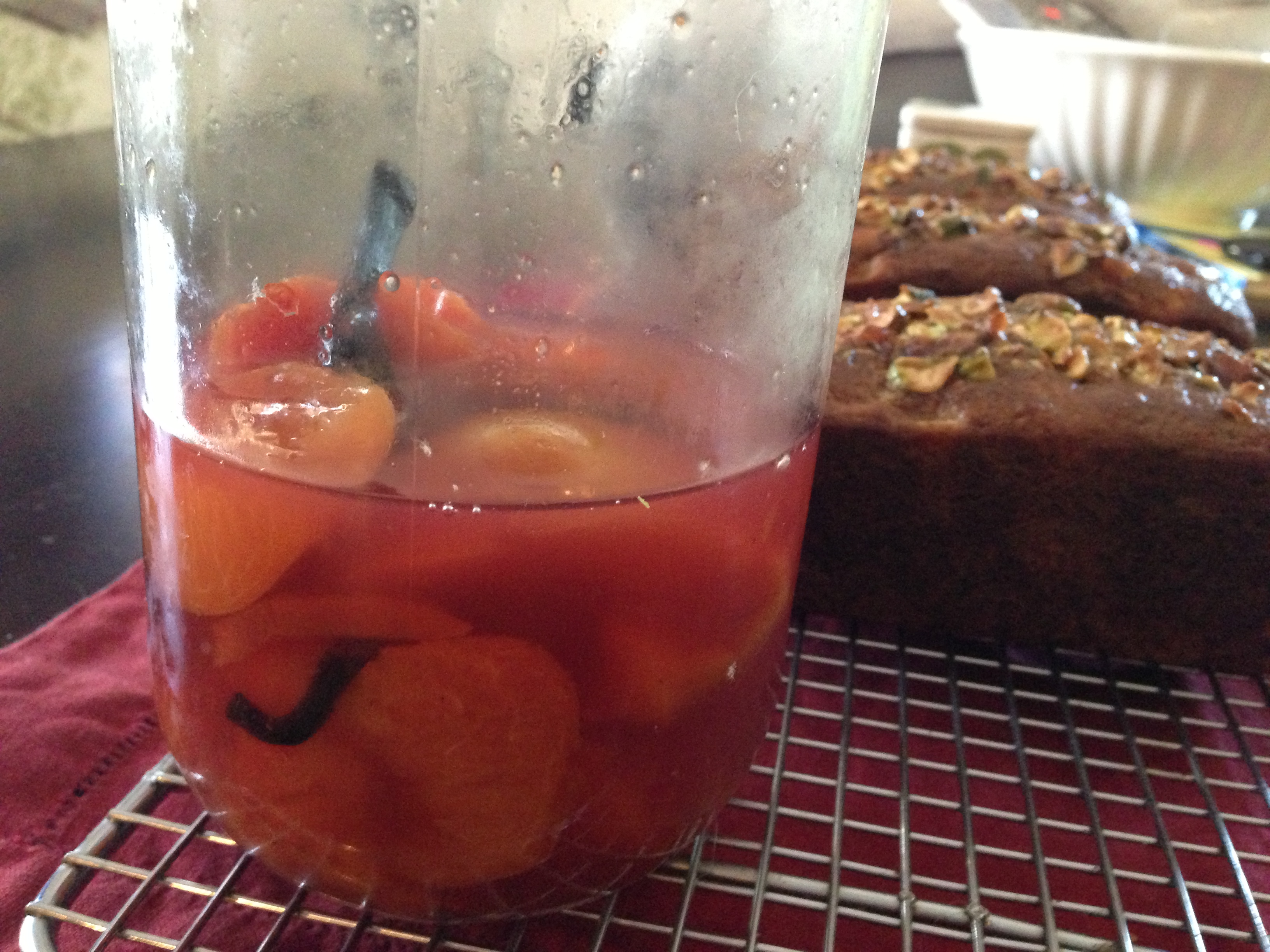 I made this loaf for a Mealku event, maybe you remember the breakfast marathon that I catered a little over a month ago. I got good reviews and it is entered on my recipe page, It was requested again for pick up today and I remembered I had never posted the recipe here, well thats sort of not true. I use the same recipe but make substitutions so this is actually my banana bread recipe with apricots and pistachio’s. It is a really good recipe, moist and flavorful. The apricots were I think the last apricots anywhere for the season, I normally poach them but since seeing the roasting method for figs a few weeks ago I decided to give that a try and it’s really good. I roasted the apricots with some cognac, vanilla bean, cinnamon and allspice, they are pretty amazing. NOTE: you do not have to use cognac or any type of alcohol you can use water or apricot nectar or even apple juice.