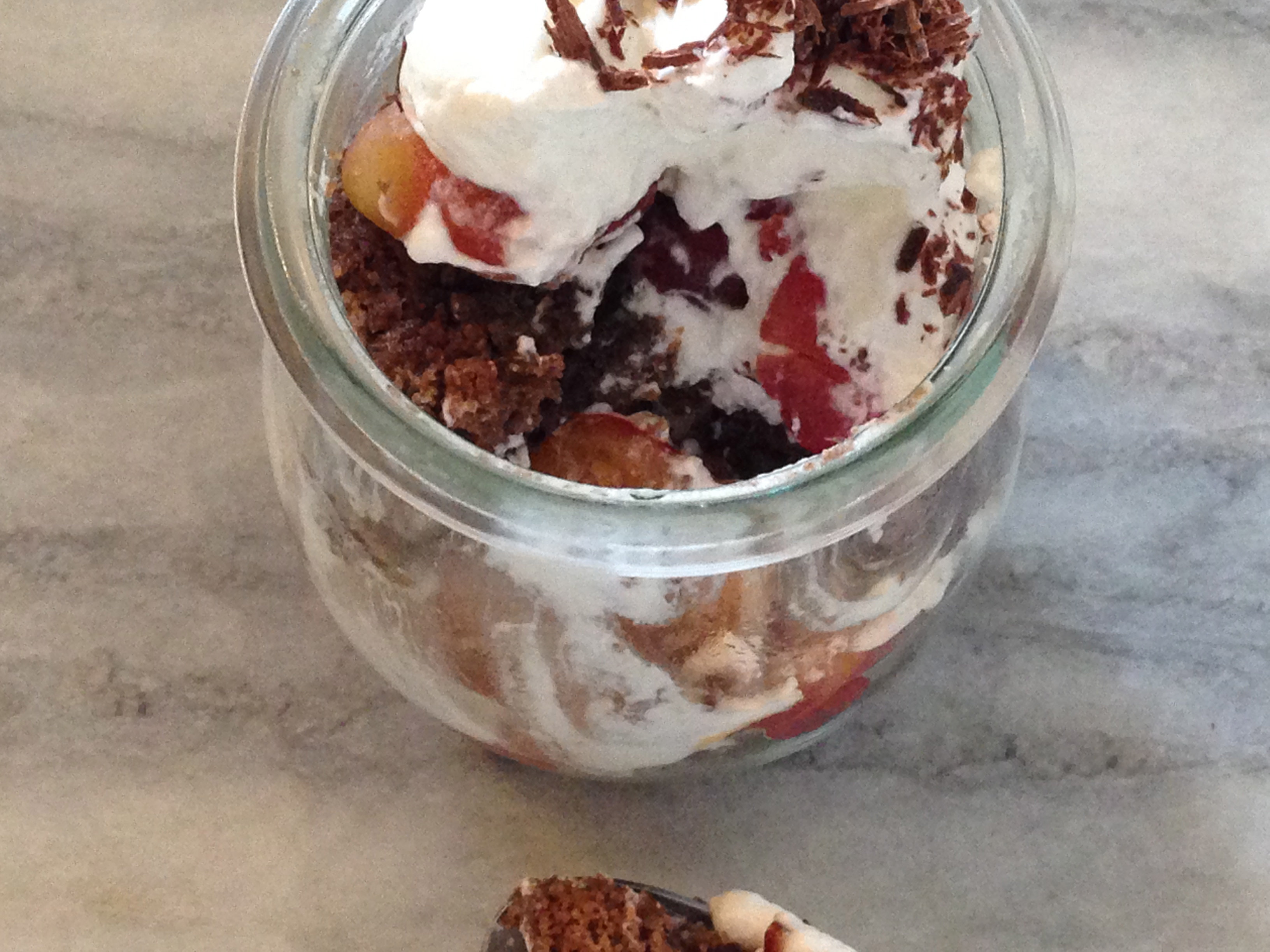 Break off small pieces of the cake and place in the bottom of each jar, spoon some of the cherries and the juice on the cake, add a dollop of whipped cream and repeat. End with whipped cream on top, add some chocolate shavings. Enjoy!