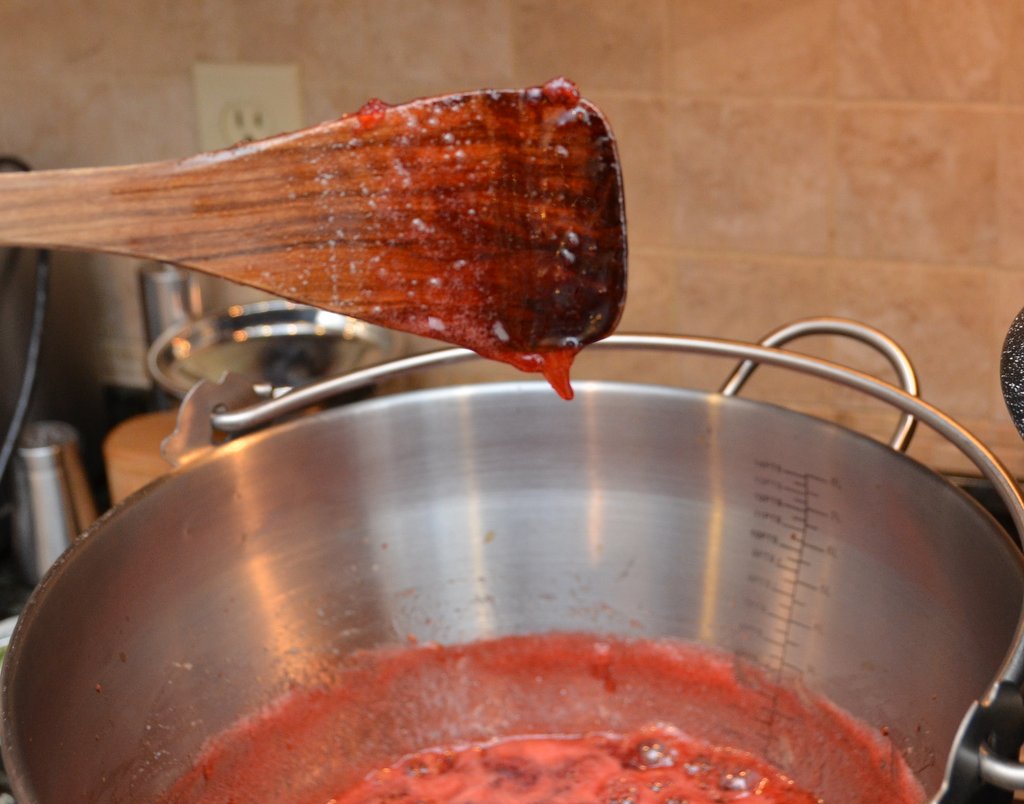 If you have a trusty wooden spoon, use that when you make jam. A great way to tell if your jam is at a set-point is if it sheets, rather than rains, off the back of the wooden spoon. A stainless, plastic or silicone implement will not work for the sheet versus rain test.