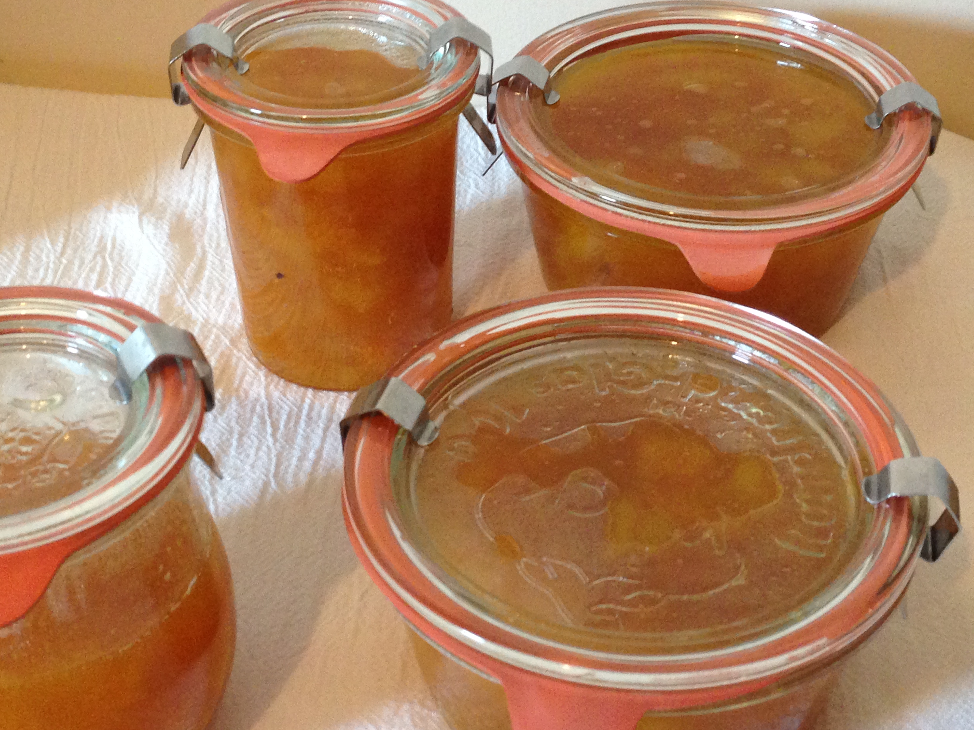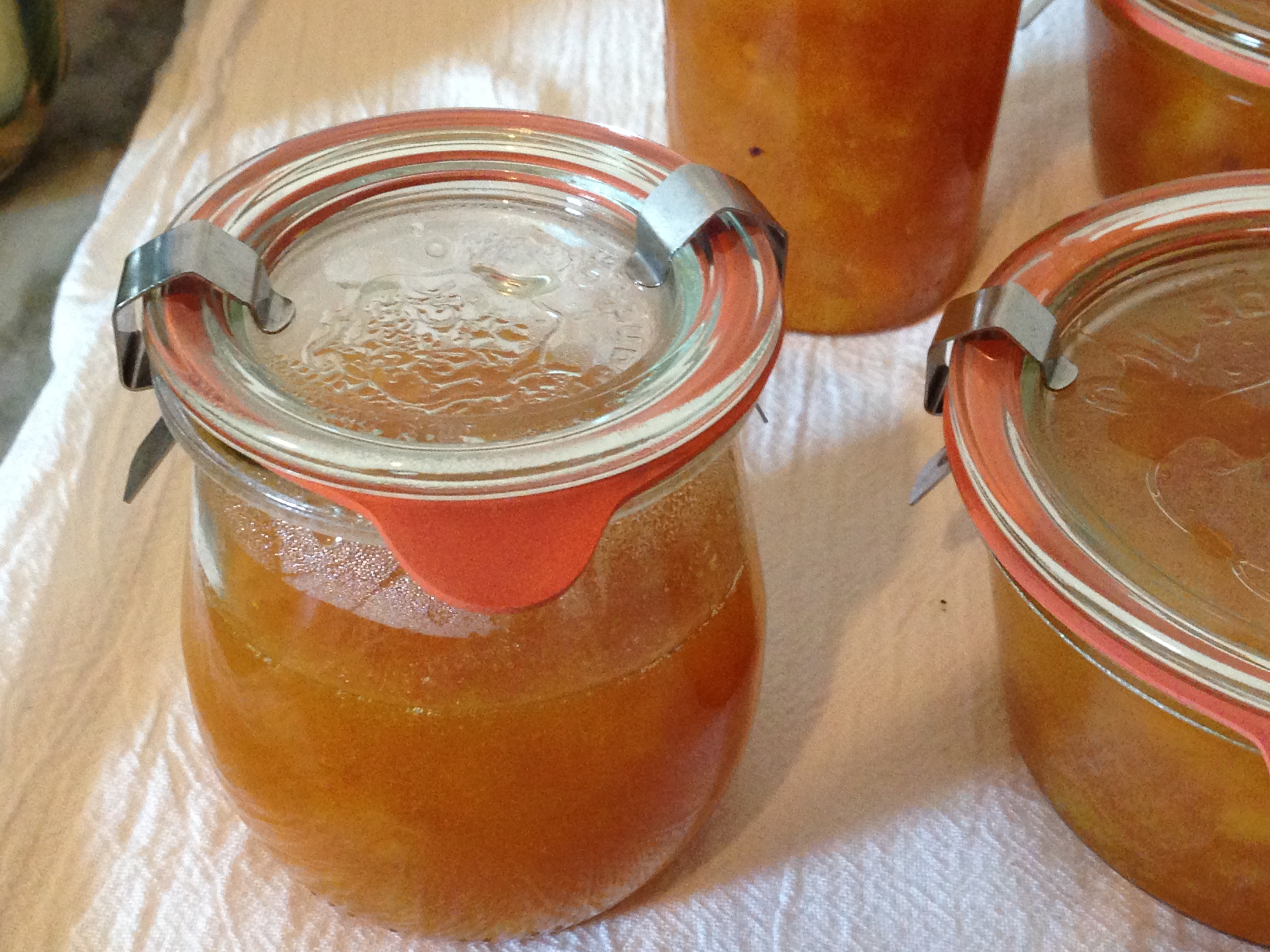I was so inspired by Emily’s guest post the other day, I decided to give canning a try. Mind you I don’t have the proper equipment but I did happen to have some unused Weck canning jars. I followed Emily’s instructions  but used peaches and apricots instead of strawberries (because I didn’t have any) The jam itself is amazing, I just got everything out of the pot after processing for 10 minutes but don’t know if it took. I can’t tell with Weck jars. I will have to read about it. I think that I will purchase a bunch of ball canning jars and have some fun. Thank you Emily for the inspiration. The tulip jar is not full so I didn’t process, that will sit in the refrigerator and get eaten immediately. I used a deep heavy pot, first sterilized the jars and then placed a round cooling rack on the bottom of the pan and brought to boiling. I didn’t have proper tongs with rubber tips so I used my regular tongs and it worked but was a bit precarious. I will invest in proper canning equipment so I can really do this right. This was fun!!