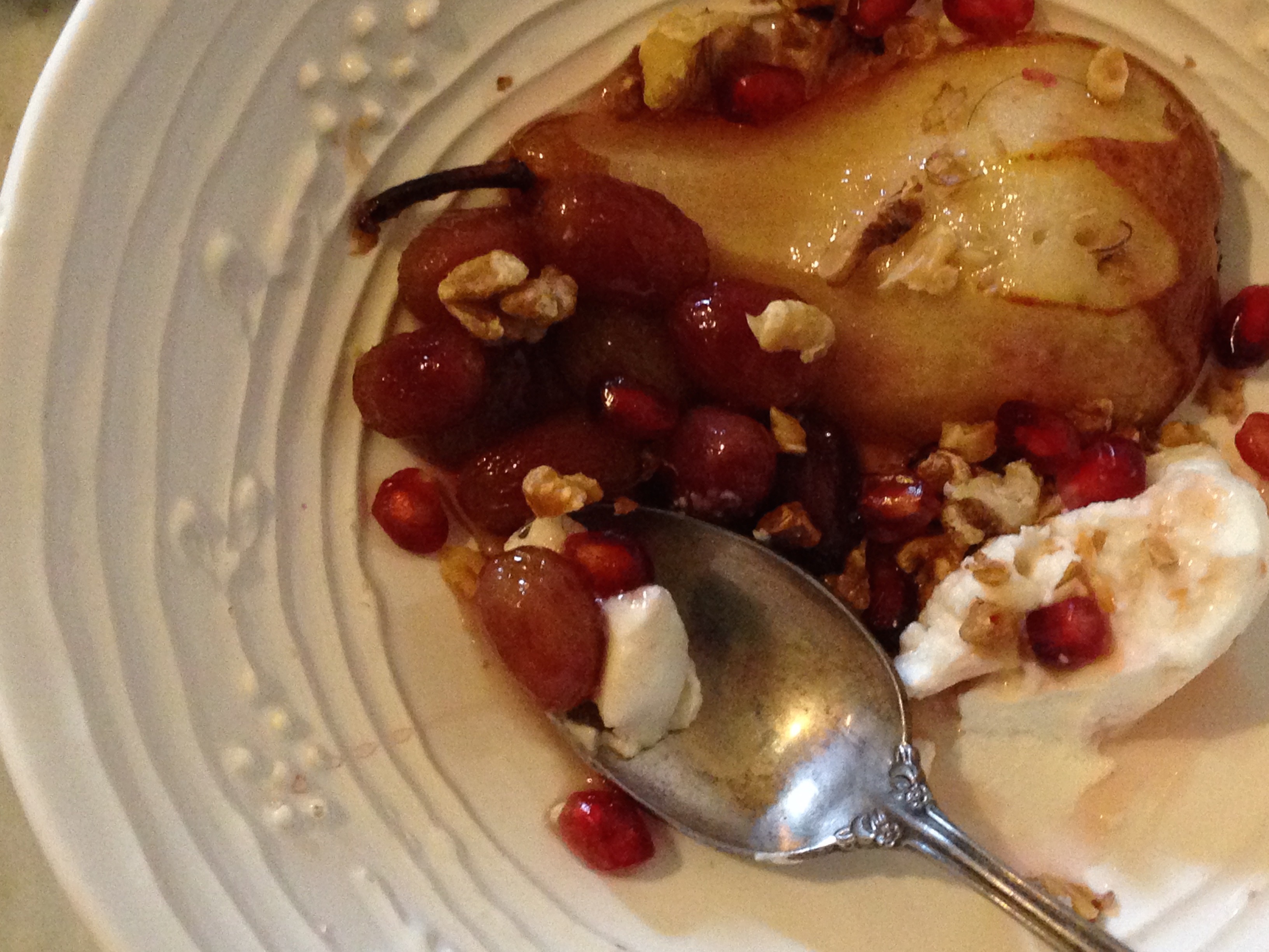 They said the recipe can be a meal, appetizer or dessert. I used Chobani plain yogurt (4% milk fat) to make a healthful dessert that is not just delicious but it would make a lovely light dessert for the holidays. I adapted a recipe for homemade Labneh from one I found on Food52, roasted some seasonal pears and some grapes, toasted some walnuts, drizzled all of this with a simple honey thyme syrup and garnished with pomegranate arils.