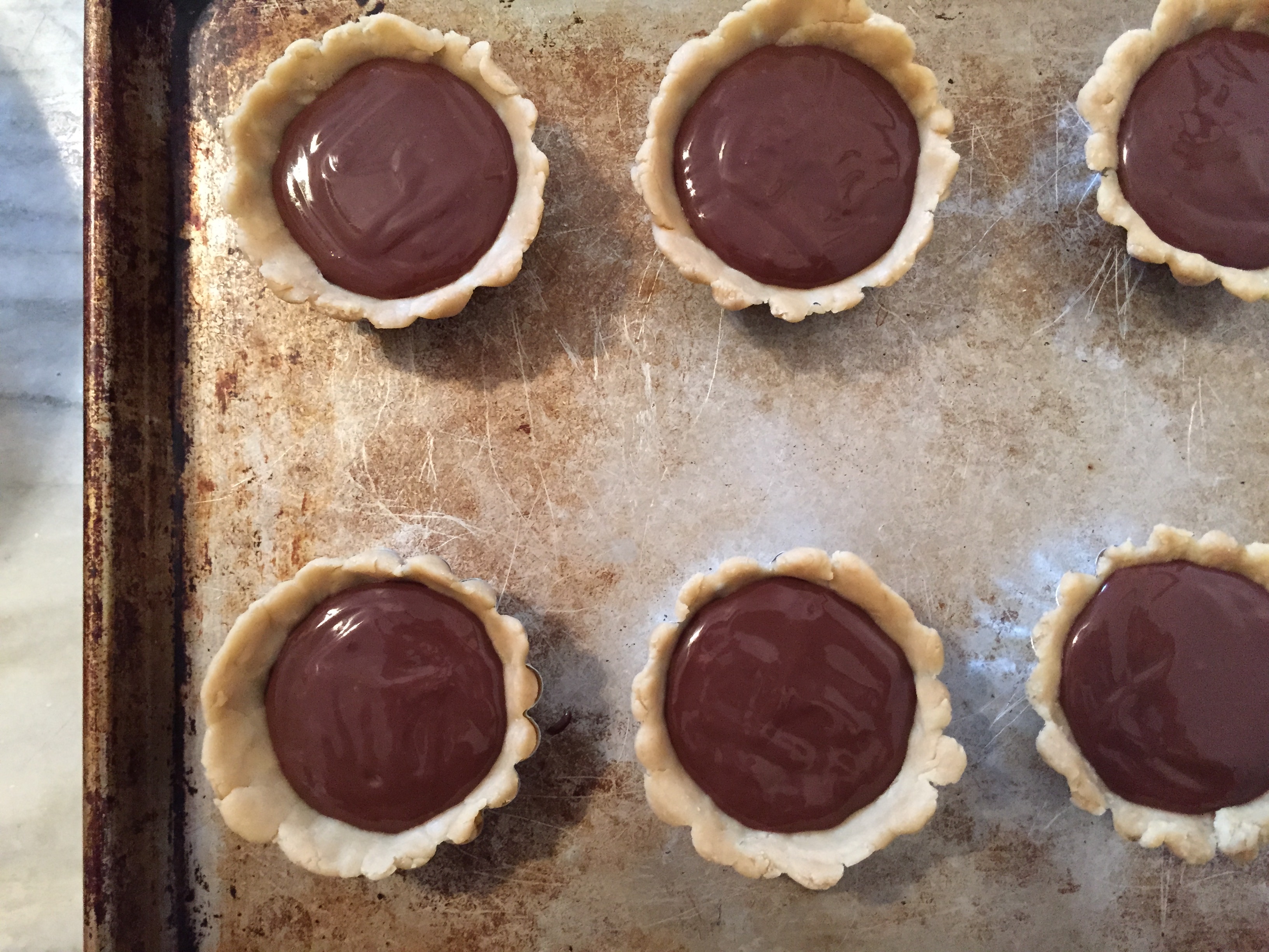 Heat oven to 350 degree’s. Flour work surface,Cut dough in half one half will be bottom crust the other top crust, place half of dough back in refrigerator while working. Have your pustie tins or fluted tartlet pans ready.Either roll or press the dough into the pans it should be approximately 1/4 in thick and should have a small overhang, if dough starts to warm put back in refrigerator. When you have put the dough in the tins, place in refrigerator while you roll out the dough for the tops, roll dough about 1/4 in thick and cut into rounds a little larger than the top of the tin. Take tins from refrigerator fill with the chocolate filling just slightly below the top of the tin. Place the top on, press making sure the bottom crust and top crust are joined and trim off any excess. Brush with egg wash and place in freezer for a few minutes just to get the pastry cold. Remove from freezer place tins on baking sheet and bake for 30-35 minutes or until golden brown. Remove from oven place on cooling rack and let sit at room temperature for 45 min to an hour or until COMPLETELY COOLED. Gently remove from the tins and refrigerate covered with plastic wrap or in an air tight container 4-6 hours or overnight.