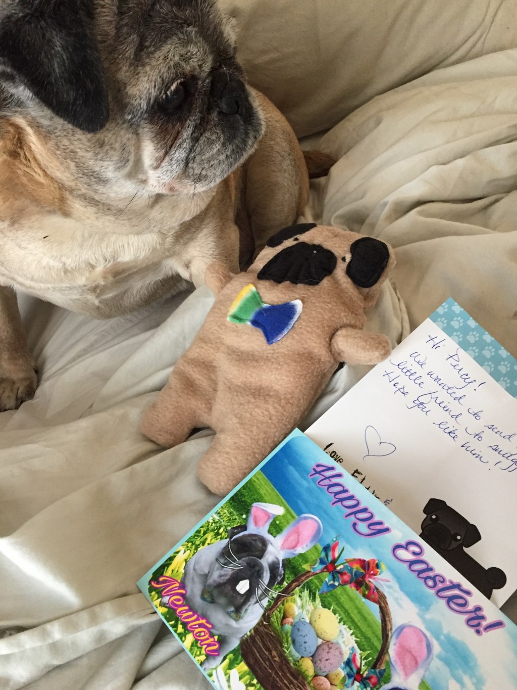 I will leave you with a photo of the goodies that were auctioned on Instagram, all the proceeds went to help a sweet little pug that needed life saving surgery, any of you that are pet parents know how expensive it is to take your dog or cat to the vet, no one should have to decide on whether or not their pet lives or dies because of money and we as a pet community on Instagram raise funds to help out those in need. I am currently finishing the baking and the box will get mailed this week. Full disclosure Easter Bunny Percy will not be included with the box of goodies. I think he makes a very handsome bunny!!