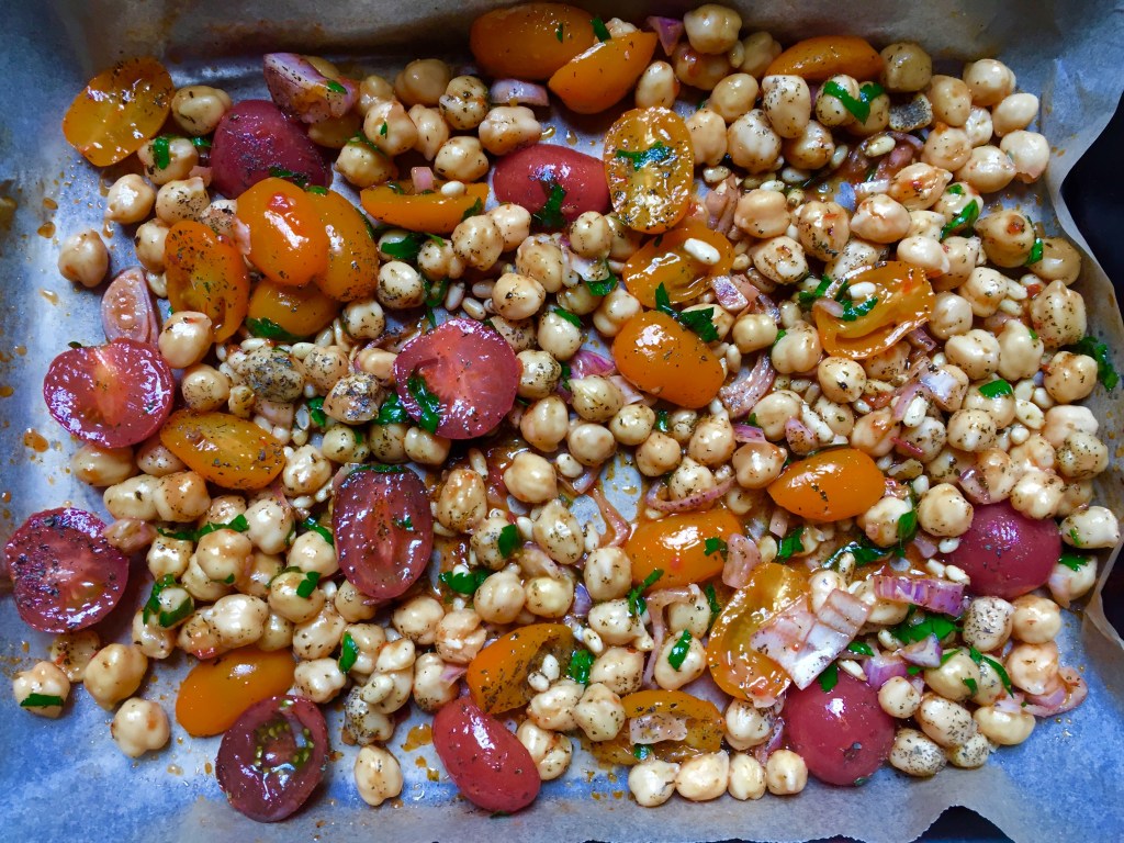Put everything in a bowl, mix it so it’s combined. Cover and refrigerate for about 2 hours or overnight. Pre heat oven to 375 and line a small sheet pan with parchment. Pour the chickpea mixture on the parchment and roast in the oven for about 20 minutes or until the tomatoes are soft and chickpeas are lightly browned.