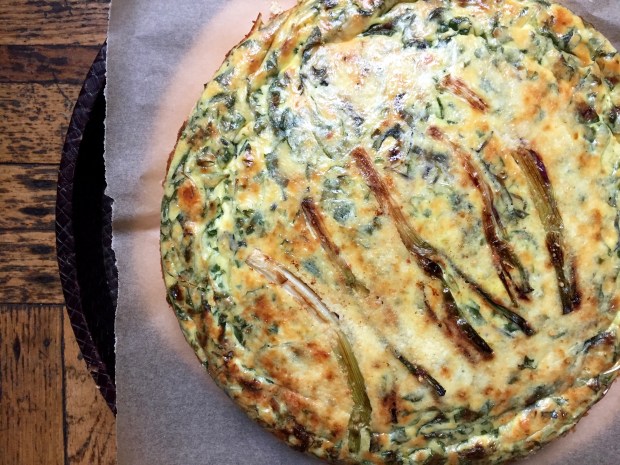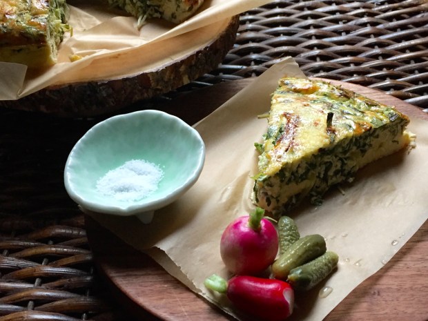 I  got a bit sidelined recently and although I made this recipe over a week ago it is just getting posted today, this recipe is delicious, easy to make and feeds an army. I was immediately drawn to it because there is no pie crust involved and it is similar to a quiche without the carb laden crust. The recipe is from Saveur, I made a few changes as I didn’t have quite enough watercress and I had some pea shoots in the crisper. They say to make it in a 9 inch spring form pan,I only had a 10 inch so added extra ingredients so it would t be as flat as a pancake. I also added more whole eggs and only 2 egg yolks. The beauty of making savory food is that you can adapt and get creative with ingredients. Here is the original recipe Watercress Ricotta Torte .