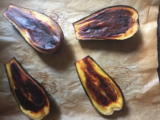 Heat oven to 425 degree’s. Line baking sheet with parchment. Brush the eggplant with olive oil on both sides. Place on baking sheet cut side down and roast for 15 minutes. They should be browned on the cut side but not mushy. Cut the eggplant into bite size pieces and set aside.