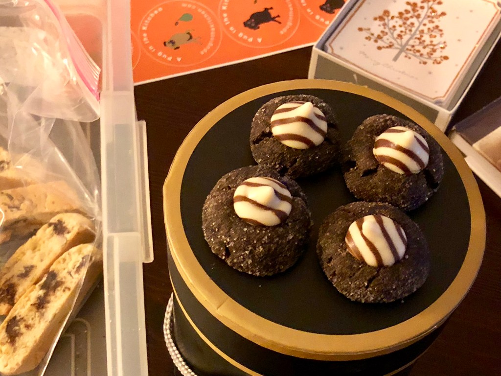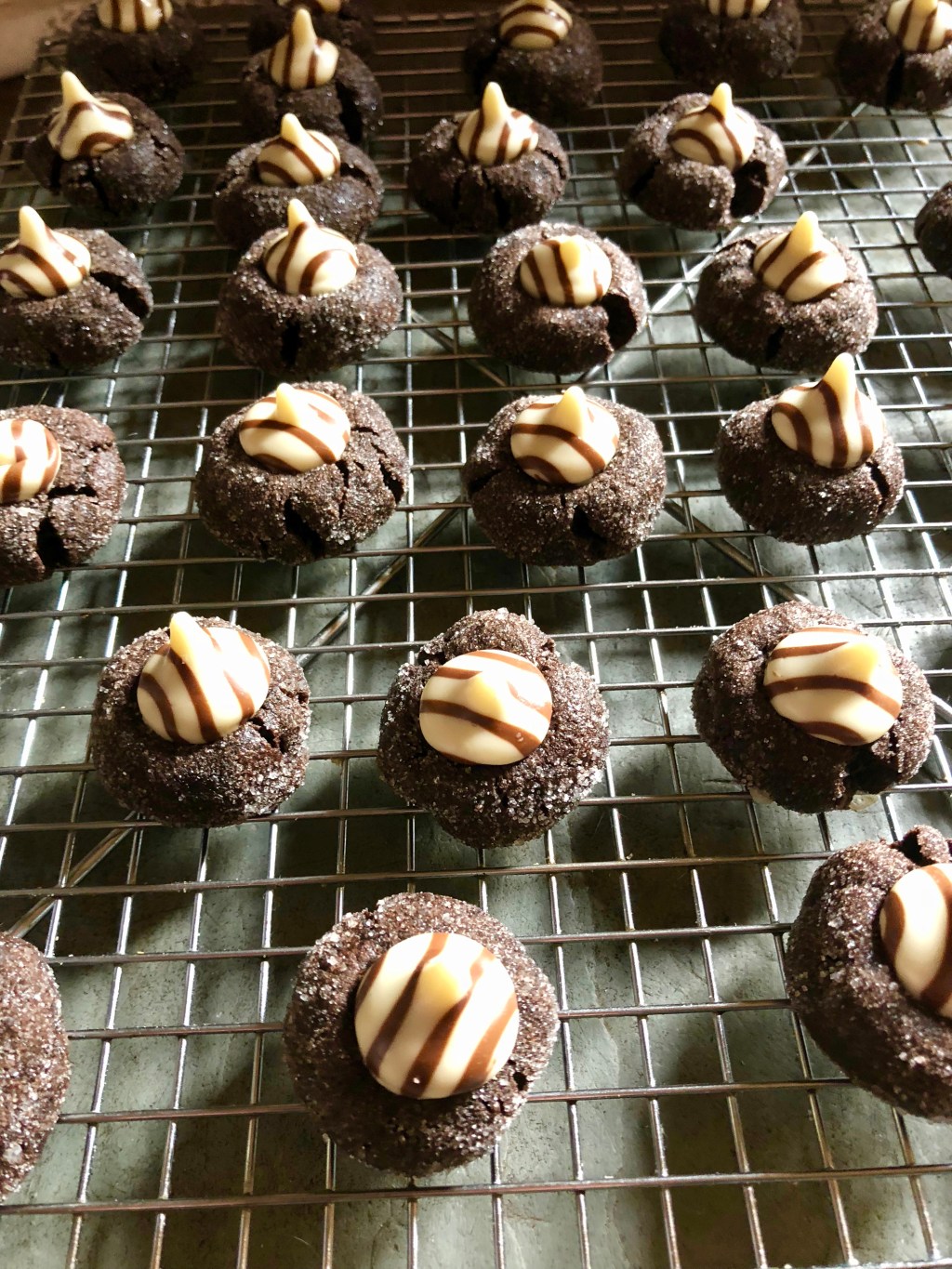 I found a great recipe for Chocolate thumbprint cookies, better than the recipe I have been using for the last few years. It’s from Martha Stewart and have to say it’s terrific. The cookies are soft and moist and I love adding the striped Hershey’s kiss in the center while the cookies are still warm.