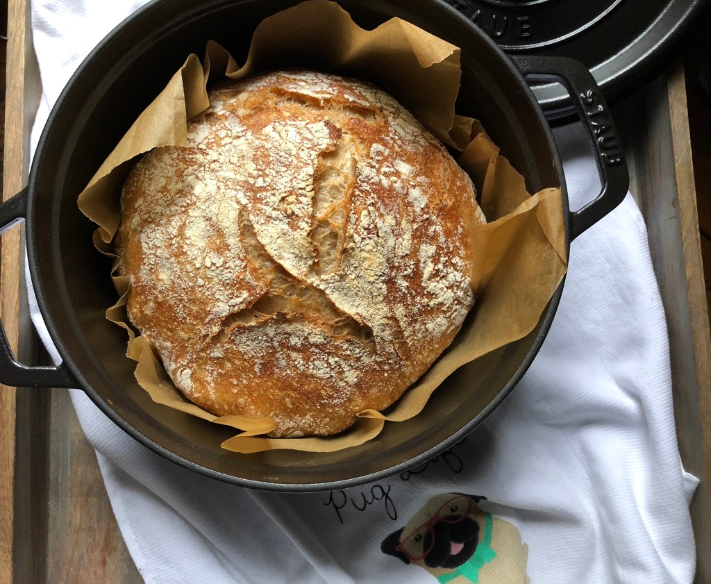 There are only 4 ingredients, you don’t knead or have to use a stand mixer or bread machine. This bread is brilliant in its simplicity and I absolutely love it. Mr. Lahey uses white all purpose flour, I chose to add some spelt as well, Christina mixed in some whole wheat flour. The basic directions are dump ingredients in a bowl, stir with your hands or a spoon, cover and let sit for 12-18 hours (overnight) dump dough onto floured tea towel, cover and let rise 2 hours, transfer to your covered pot and bake on high heat. Simple, easy and delicious. This recipe is a keeper and would be a great bread for the novice bread baker.