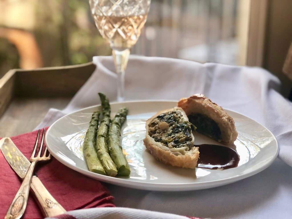 Happy New Year! I hope you all are doing well, staying healthy and weathering this pandemic. 2020 Has been a rough year, there is no glossing over that. My hopes and wishes for everyone is that 2021 will be a year of health and happiness and prosperity for you all. The holidays this year were different to say the least, most of the time was spent alone, well thank goodness I have Jenna Rose, she is always good company, even when she is sleeping which is most of the time. I baked cookies for friends and clients and Jenna and I delivered them, on Christmas Day a dear friend came over and I made dinner. She is vegetarian, I wanted to make something special and thought a Wellington would be nice so I researched and zeroed in on 4 recipes, I took bits and pieces from each, added my own touches and voila, a delicious mushroom Wellington. It may sound imposing but actually its quite simple, especially when you can buy amazing pre made puff pastry (Dufour’s). The filling can be made in advance and putting it all together before baking is a simple process. The port wine reduction is in my opinion what takes this over the top.