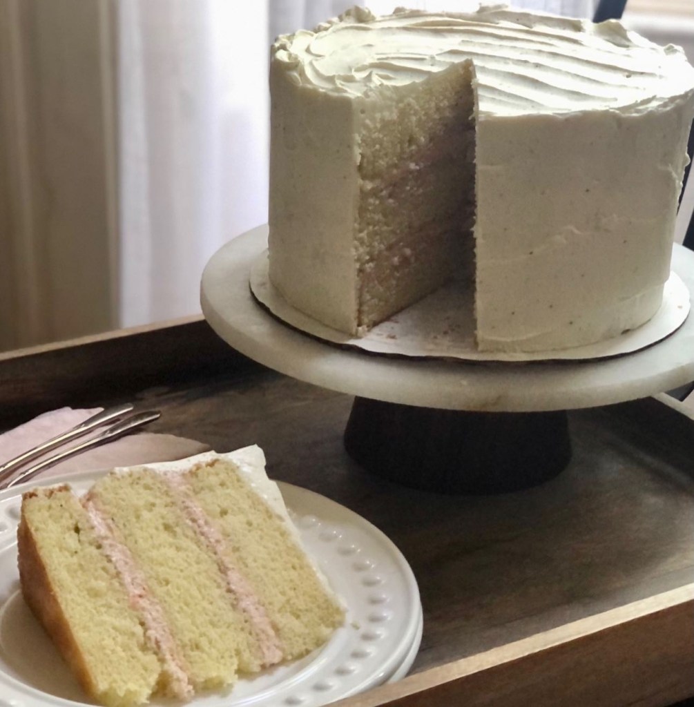 It has been a long time since I’ve posted anything on the blog, I mainly use Instagram and sadly have neglected my little blog. I hope everyone is well! The other day I bought some beautiful rhubarb, I usually roast it and eat with ice cream or make a tart, this time I wanted to do something a little different. A rhubarb mousse sounded great and I thought that making it the filling for a yellow (vanilla cake) would be different and delicious. I wanted the mousse to hold us as a filling and I researched several recipes online. I found one in the NYT that sounded good, it has strawberries in it and Kirsch so I made some changes and made this my own. I omitted the strawberries and Kirsch and added 1/4 c sugar to the whipped cream as rhubarb is quite sour. It is absolutely delicious. I used my go to yellow cake recipe and stabilized whipped cream frosting. The cake is light as a feather, creamy and moist, it’s not overly sweet. This just may be my new favorite cake.