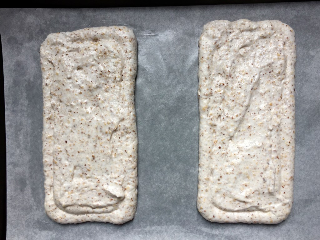 Sprinkle the nut mixture on top and gently fold into the meringue until combined. The consistency will be thick and gooey. You can either use a piping bag with a 1/2 inch plain tip or spread the batter in the rectangles 3 inches apart as they will expand. Place in the oven and bake for approximately 2- 3 hours or until they are firm to the touch. Turn off the oven and let them sit with oven door closed for 6 or more hours. NOTE:Although the recipe does not say to, I rotated the pans every now and then to ensure even baking. I used 2 sheet pans because I was afraid they would run (they didn’t) and the pan on the lower rack browned more quickly.Also the dacquoise were done at just slightly over 2 hours, so I turned off the oven and let them sit for about 6 hours. After turning off the oven I waited about 20 minutes and then gently loosed them. Believe me, it helped greasing the parchment they gave way easily and there was no sticking.