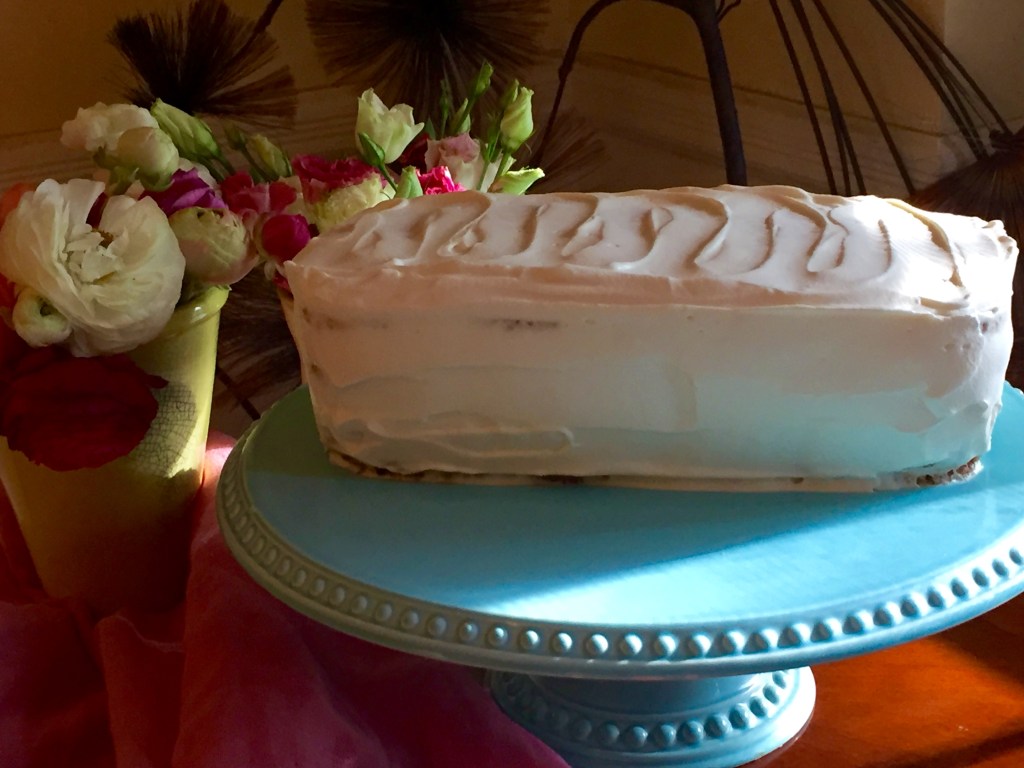 Set pan with about 2 inches of water on low heat, place the egg whites and brown sugar in mixing bowl and set on top of the simmering water (bowl should not touch the water). Whisk until mixture is warm to the touch and sugar is completely melted. Place on stand mixer with whisk attachment and mix on medium speed until fluffy and completely cooled, approximately 15 minutes. Change to paddle attachment and add the soft butter 1 tbs at a time while the mixer is on med low speed. Once butter is incorporated continue to mix on medium speed for another 3-5 minutes. If it curdles it’s ok, keep mixing it will come together. Frost cake immediately. I piled way too much frosting on top, don’t do like I do and make sure the frosting is evenly spread all over the cake. Thats what happens when you are in a hurry.