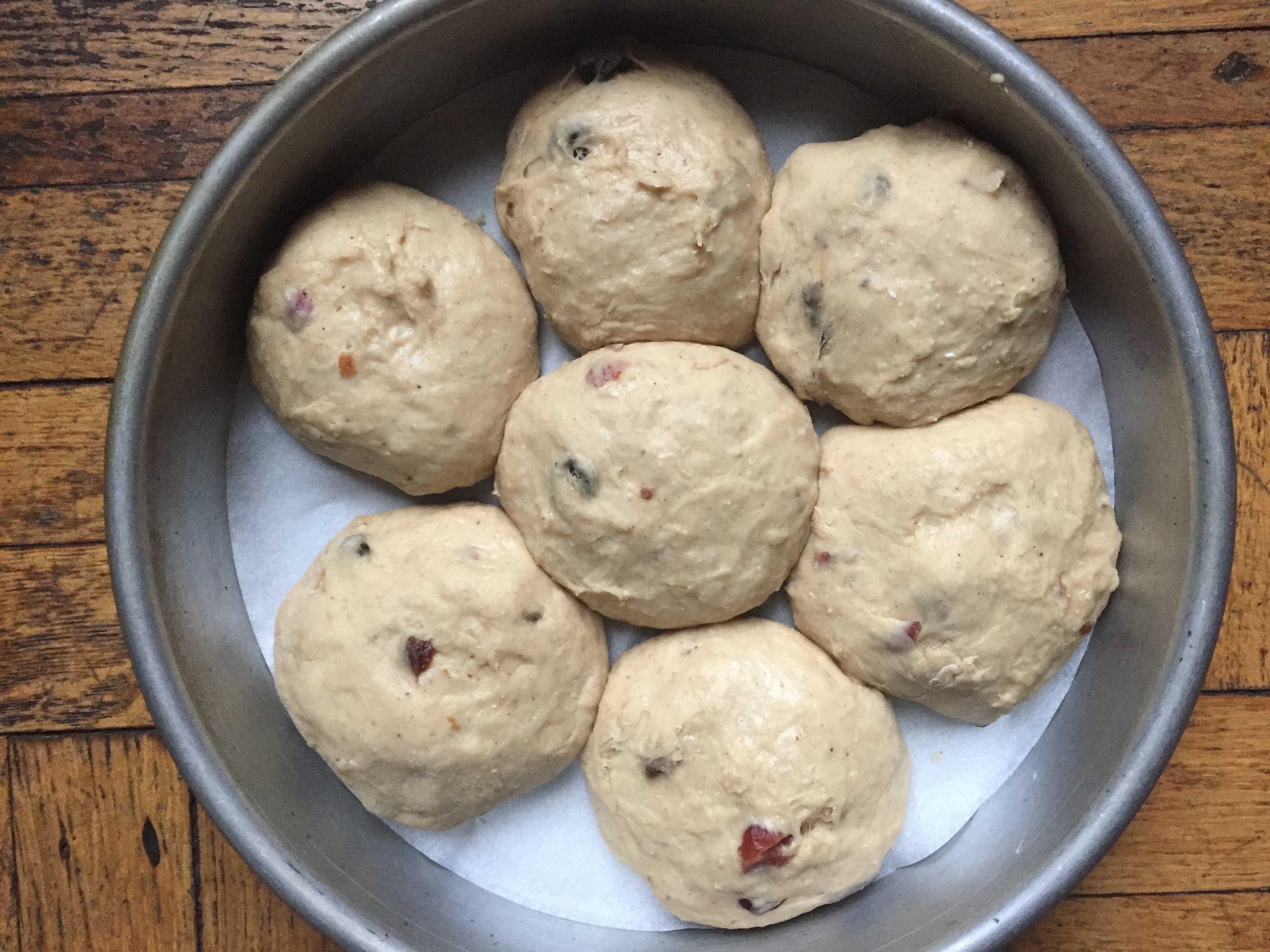 Divide the dough in half if using the 8 1/2 x4 1/2 loaf pans or if using a larger loaf pan you will need to adjust for size. Shape into a log and place into a lightly greased pan, cover with a lightly greased sheet of plastic wrap and cover with a tea towel and let rise until they have crowned about 1 inch over the rim of the pan it takes 1-2 hours.