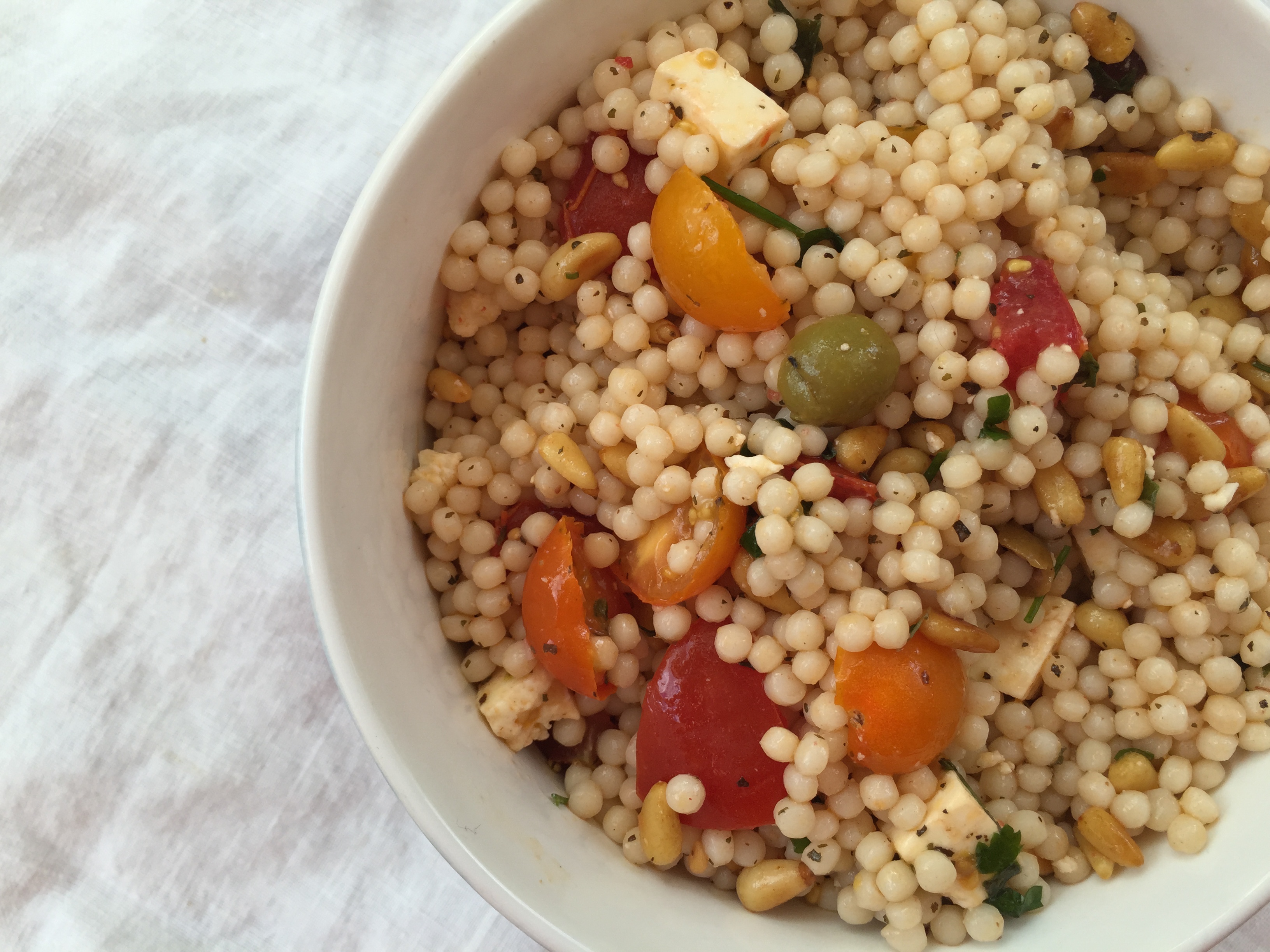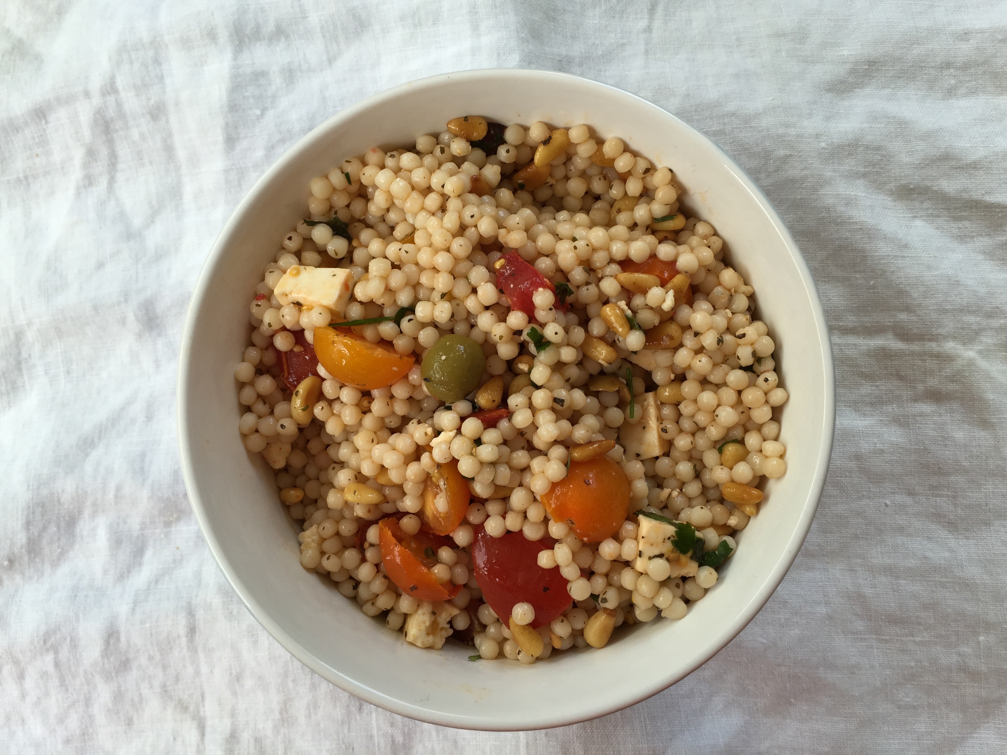 Make the cous cous first, bring a pot of generously salted water to a boil, add the cous cous and cook for 8-10 minutes. Remove from stove and pour into a strainer, run cold water over it to stop the cooking process, it’s ok if they are slightly hard. They will soften in the dressing and I recommend letting this sit for a few hours or even over night. I chop the tomatoes, add the herbs and olives and toss in the cous cous, toast the pine nuts and crumble the feta into the salad, squeeze some lemon and drizzle on the olive oil, do this according to however you like it. Season with salt and pepper. There is no right or wrong way to make this salad, really!!! Have fun with it.