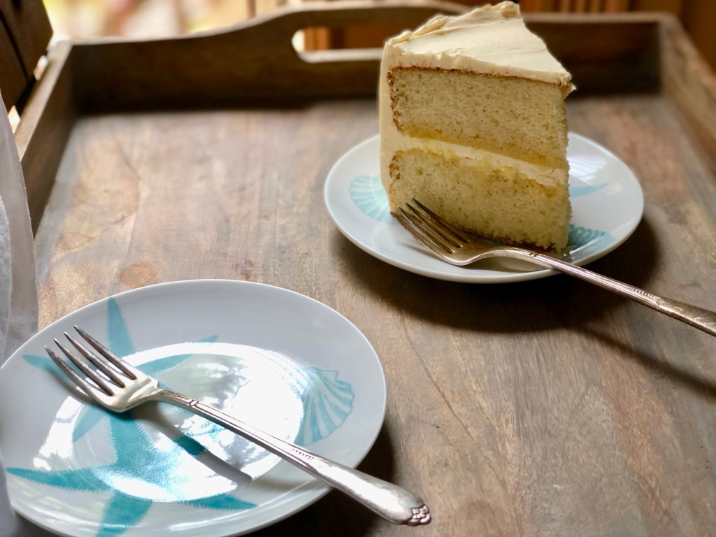 With mixer running add the butter 1 or 2 tbs at a time. The volume of the meringue may decrease but that’s ok keep whipping and don’t be alarmed if it looks soupy. Keep whipping, as you add the butter it will start to thicken. The frosting will be soft and billowy, now add the vanilla and elderflower liquor, whip until mixed. Use immediately but also note the buttercream can be stored in a zip lock bag in the refrigerator for later use but you will need to bring to room temperature before you frost the cake.